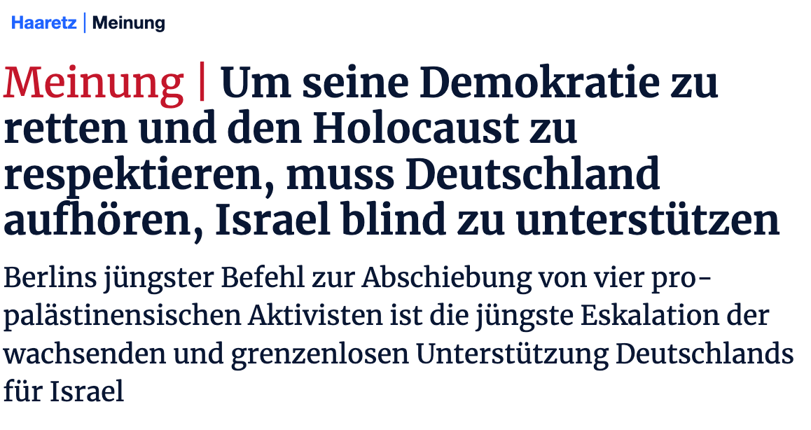 In einer kürzlichen Eskalation ordneten die Berliner Behörden die Abschiebung von vier pro-palästinensischen Aktivisten an – drei EU-Bürgern und einem Amerikaner, von denen keiner wegen eines Verbrechens verurteilt wurde. Vielmehr ging es unter Berufung auf Staatsräson ihre angedrohten Abschiebung darum, antiisraelische Ansichten abzuhalten. Obwohl eine dieser Deportationen später vom Berliner Verwaltungsgericht für ungültig erklärt wurde, folgte der Schritt auf 18 Monate Absagen, Verbote und Entlassungen von Künstlern, Akademikern und Referenten – Palästinensern, Juden, Israelis und anderen –, weil sie sich gegen Israel ausgesprochen hatten.