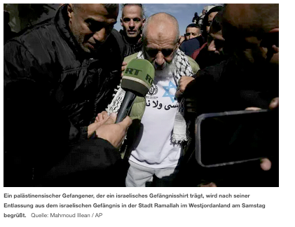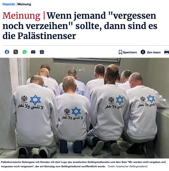 Ein Bild ist mehr als tausend Worte wert: Hunderte von palästinensischen Häftlingen und Gefangenen, die am Samstag freigelassen wurden, sind auf den Knien, im Gefängnis zu sehen, in weißen T-Shirts mit einem blauen Davidstern und den Worten "wir werden nicht vergessen noch vergeben". Israel zwang sie so, in seiner verabscheuungswürdigsten Form zu wandelnden Bannern des Zionismus zu wandeln. Letzte Woche waren es Armbänder mit einer ähnlichen Botschaft: "Das 'ewige Volk' vergesst nie, ich werde meine Feinde verfolgen und finden."