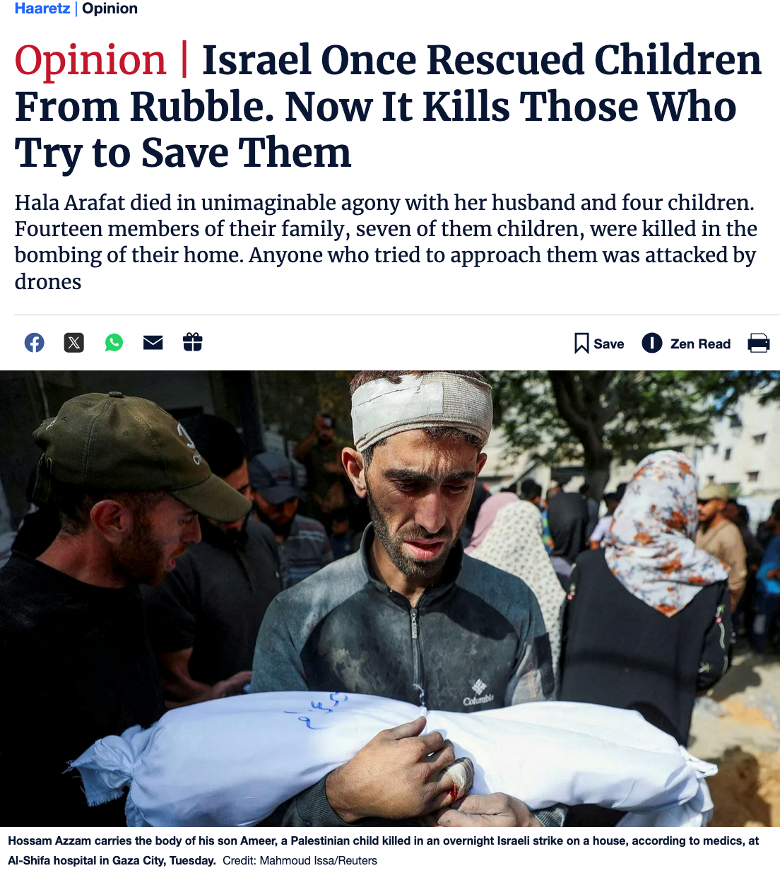 Halas letzte Worte und die Hilflosigkeit, sie zu retten, sind unversöhnlich. Eine Frau, die in den Trümmern ihres Hauses gefangen ist, sollte einen starken Wunsch wecken, sie zu retten. Aber die Situation veranlasste die IDF, die UAVs zu entlassen, um die Retter zu liquidieren, wie es am Mittwoch in der Zarqa-Straße in Gaza-Stadt geschah.
