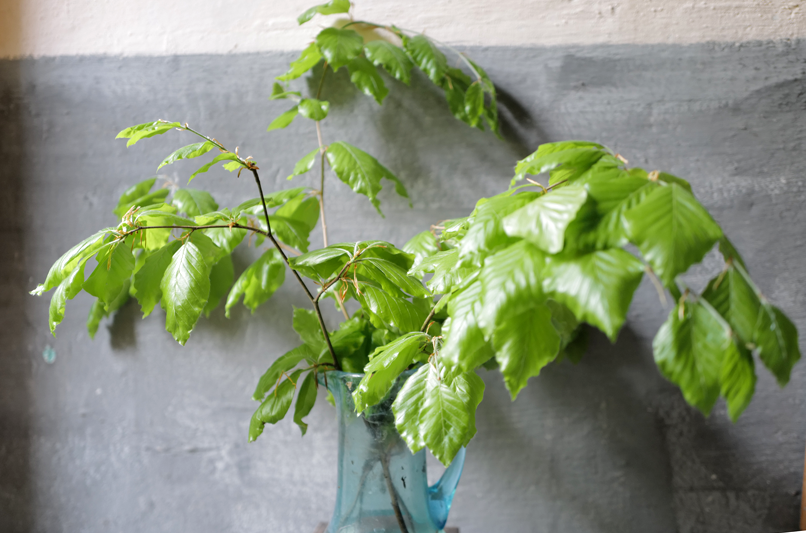 Länger als alle blühenden Zweige hielten die neuen Blätter der Buche in der Vase, Frisch geschlüpft und locker entfaltet.