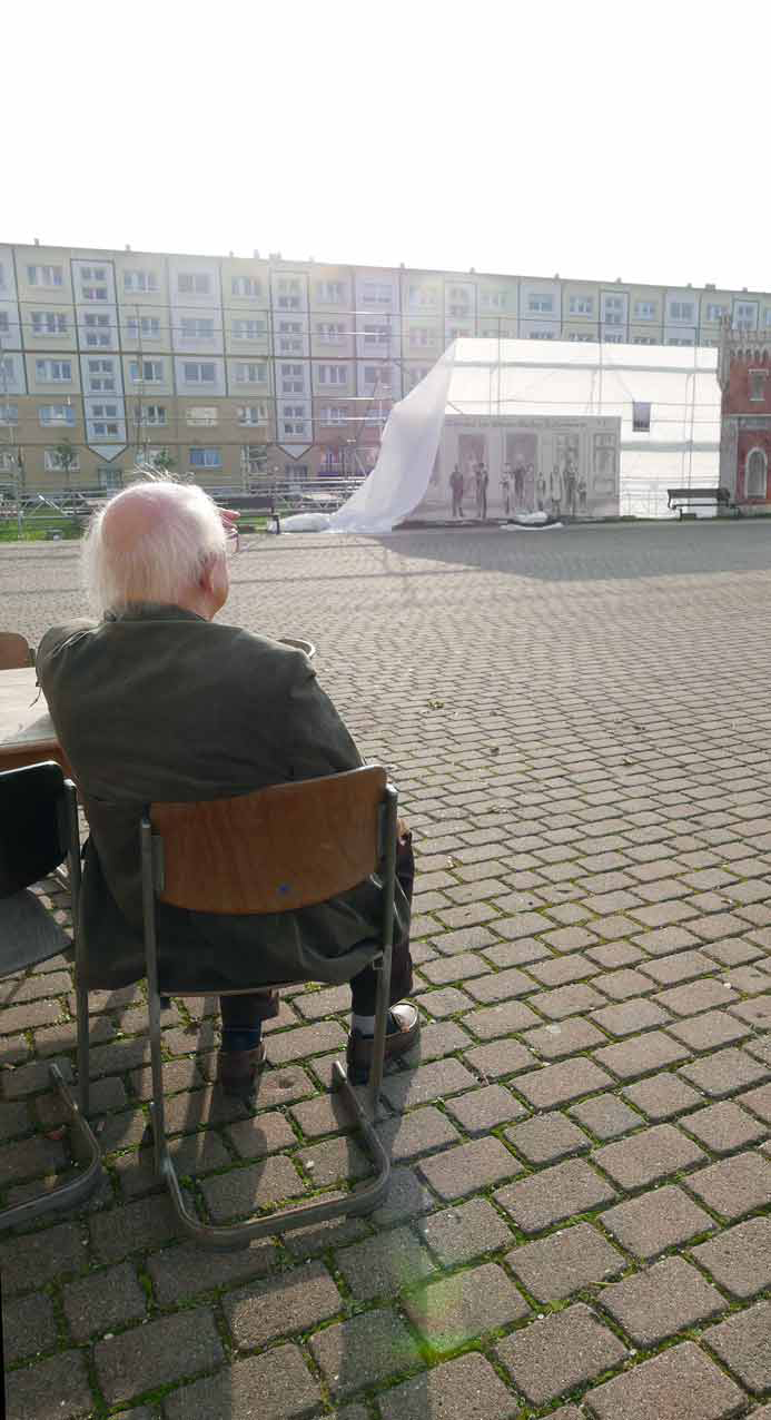 Hans, der Freund aus Rostock, der ersten Jahre nach Nossendorf 1945 und dann in die Welt von dort, nun in Demmin am 8.Okt. 2015 sieht was dort geschieht. In helle Wand gehüllt das Leben vor 75 KajhrenVor der architektonisch langweiligen Plattenbau-Fassade nochmal die Erinnerung, was da war . Leben, wo nun alles unten dem Rasen liegt, der Leere. Sitzt auf Steinen der Pflasterung wie die Platten der Bauten langweilig. Vorher jeder Stein anders wie die Menschen. Aber wieder an einem Tisch auf dem Rest des Markts