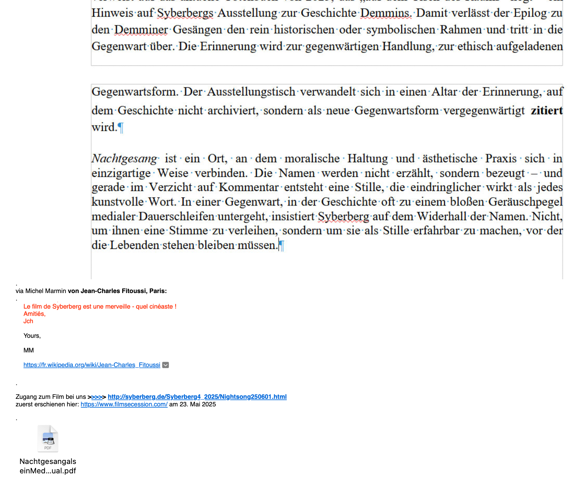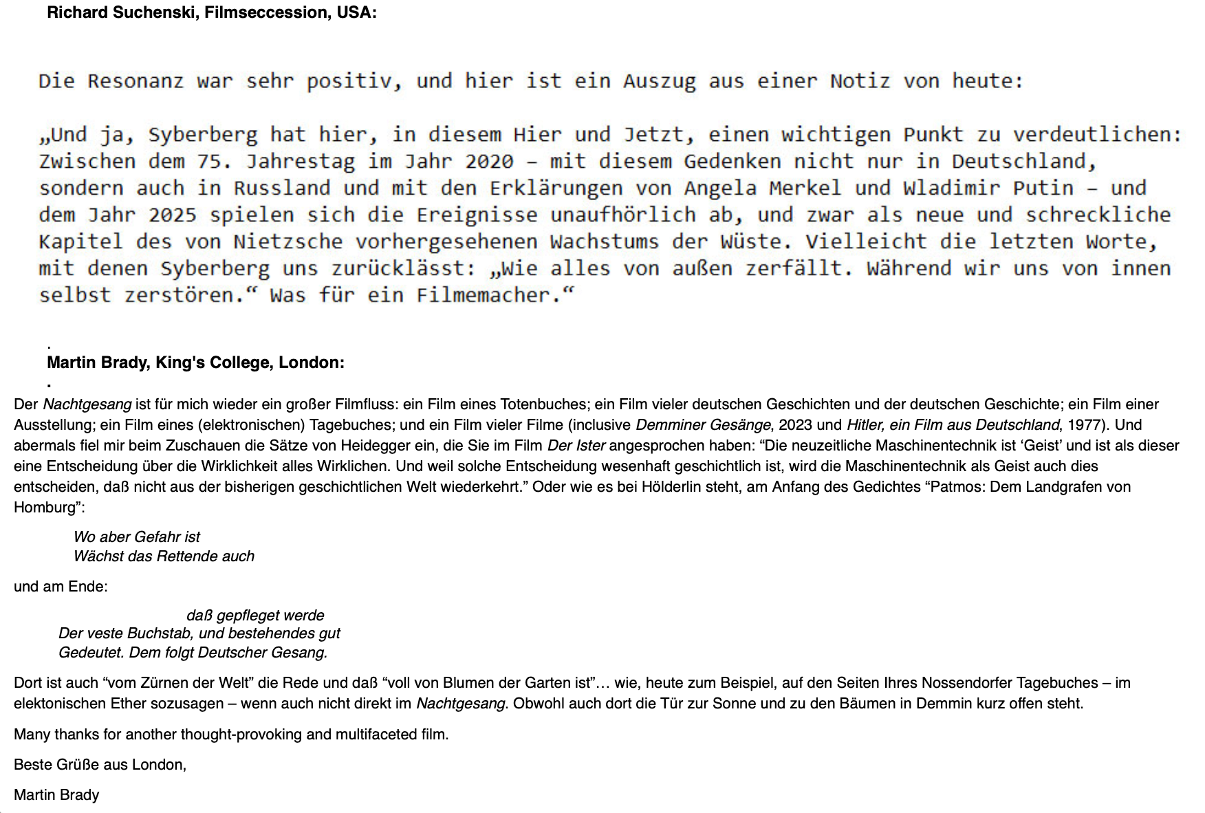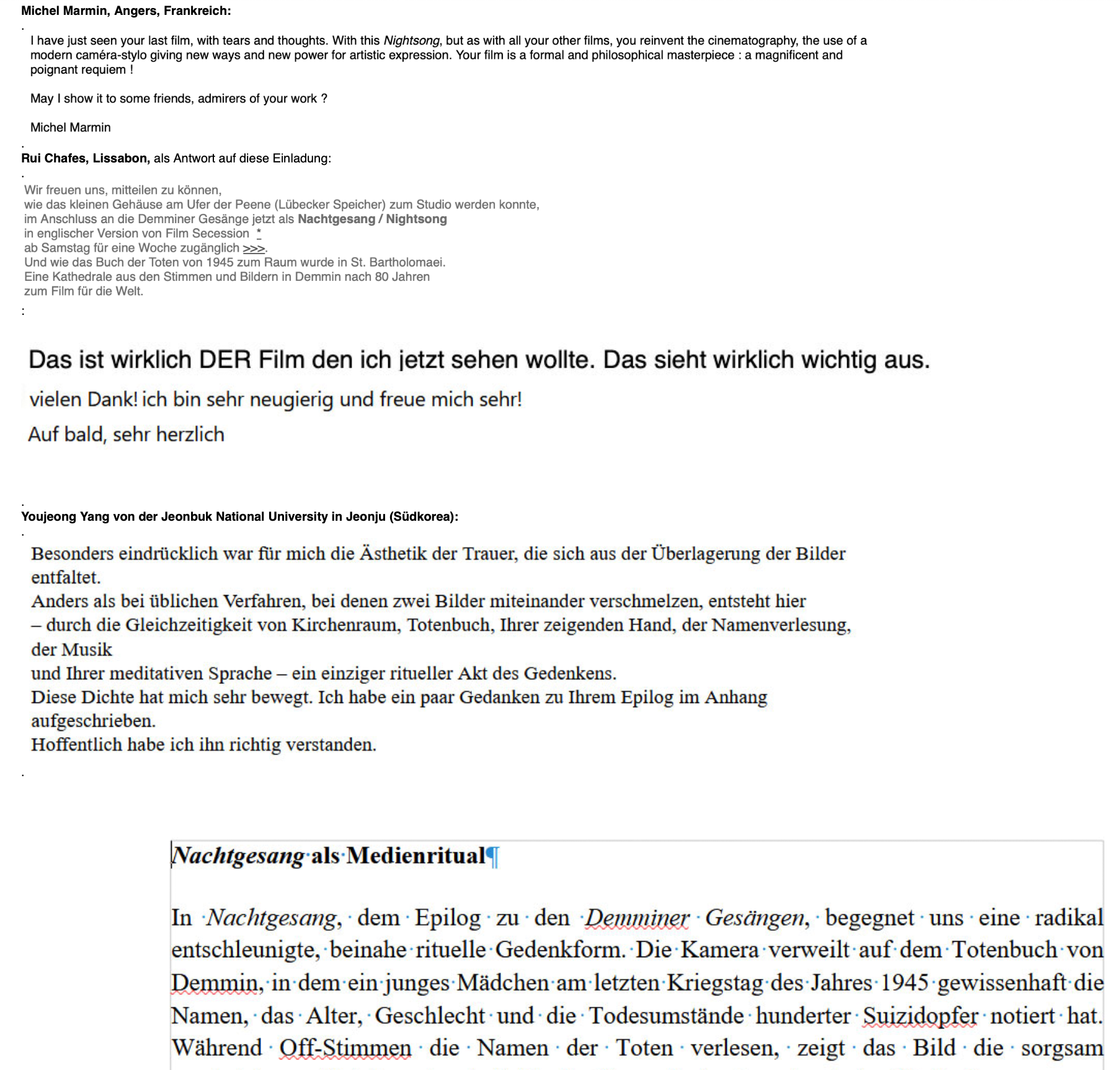Anfang Mai . Das End-Spiel Demmin 1945 als Raum am Hafen, Mit Hunderten Toten iden Füssen um die brennende Stadt, als die Russen kamen., im kleinsten Raum unter den Speichern am toten Hfen. Dann als Film mit den Stimmen der Toten aus ihrem Buch. Seit 3 Wochen im Internet zu sehen. Kein Interesse aus Deutschland . Aus dem Ausland die folgenden Worte bisher aus den USA, Frankreich zweimal, London, Lissabon, Korea. Das Echo der Welt - wohin?