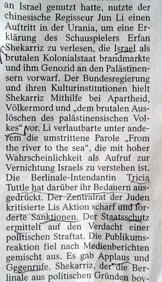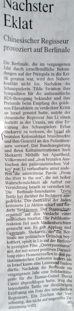 Remember the golden stones in Charlottenburg. Because of them, everything is permitted to us – absolutely anything – including ethnic cleansing, which Riba, of course, places in quotation marks, and even genocide. After all, her great-grandfather was murdered.
