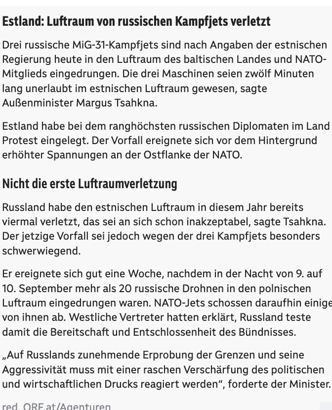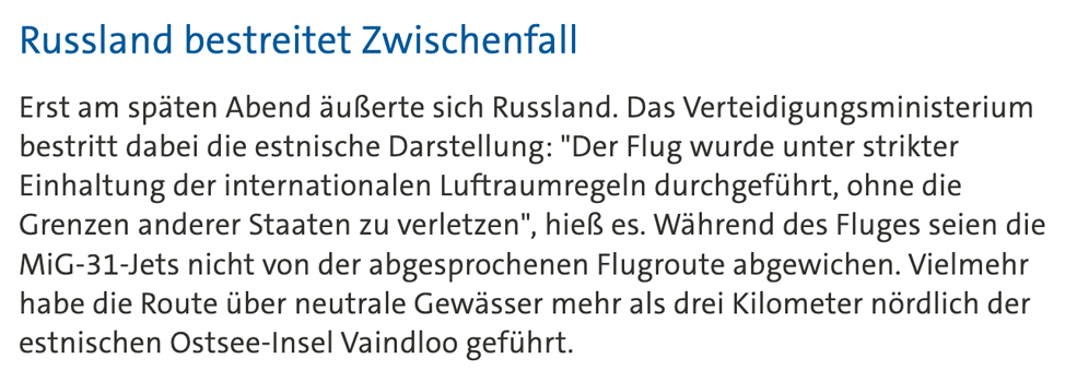 Während des Fluges seien die MiG-31-Jets nicht von der abgesprochenen Flugroute abgewichen. Vielmehr habe die Route über neutrale Gewässer mehr als drei Kilometer nördlich der estnischen Ostsee-Insel Vaindloo geführt.