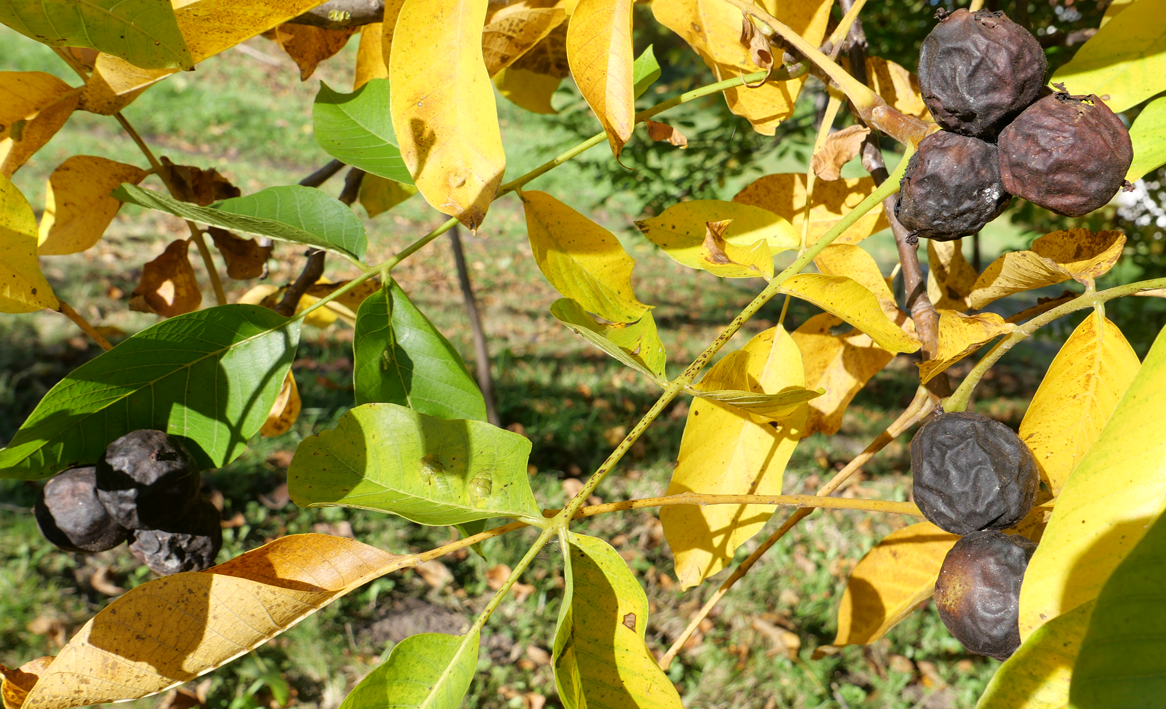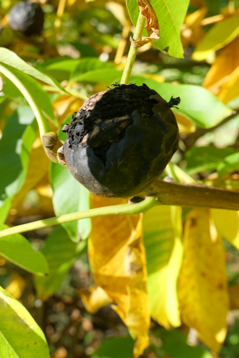 Hängen am Walnussbaum schwarze Nüsse, ist das ein Anzeichen eines Walnussfruchtfliegenbefalls. © dpa/Rolf Haid