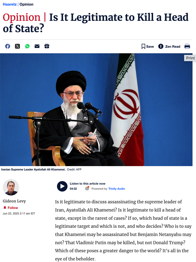 Meanwhile, the defense minister is playing God. In this capacity, Israel Katz announced that Khamenei cannot be allowed to "continue to exist." What are Katz's criteria for being allowed "to exist"? He decides who shall live and who shall die? A heavenly court led by a laughable Israeli cabinet member? Is Iran's defense minister allowed to threaten his Israeli counterpart with murder?