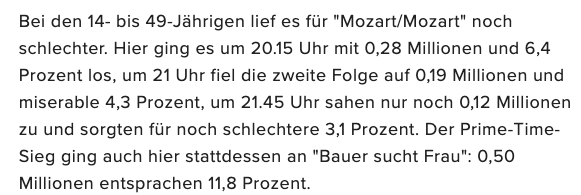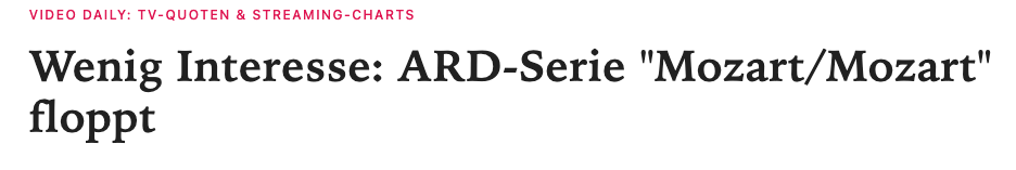 Warum ist diese öffentliche Verhandlung wichtig, im Sinne letzter Lebensspuren unserer Kultur. Vieles ging verloren. Die Musik ist letztes Gut in den Medien als Film in diesem Fall an öffentliche Organe unserer Sozietät gebunden. Wenn, wie an diesem Beispiel offenbar, fahrlässig okkupatativ damit umgegangen wird, muss das zum Fall werden . Wenn Mozart -eindeutig definiert- draufsteht und absichtlich nicht an seinen Dimensionen gemessen, geliefer wird, müssen wir fragen, von wem und warum so verantwortet. Zu wessen Kosten. Und mit dieser bisher absehbar negativen Resonnanz. Zumal der nächste Fall dieser Art - gemessen an den Ankündigungen- vor der Tür steht: das wäre Ludwig II als The King. >("mit einer hochkomplexen Psyche in einem LGBTIQA+ feindlichen Umfeld, jedoch auch Auslöser von #MeToo Debatten und dann selbst wieder Opfer von Fake News"). Vorsicht Richard Wagner untrennbar aber nicht aus Bayreuth heute.