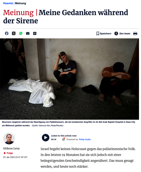 Dies ist kein Vergleich zum Holocaust, sondern eine schreckliche Warnung, wohin die Dinge gehen. Heute nicht daran zu denken, bedeutet, die Erinnerung an den Holocaust und seine Opfer zu verraten. Heute nicht an Gaza zu denken, bedeutet, die eigene Menschlichkeit zu verlieren und die Erinnerung an den Holocaust zu entweihen. Es ist ein Warnsignal gegen das, was noch kommen wird.