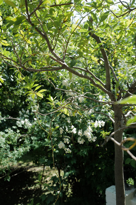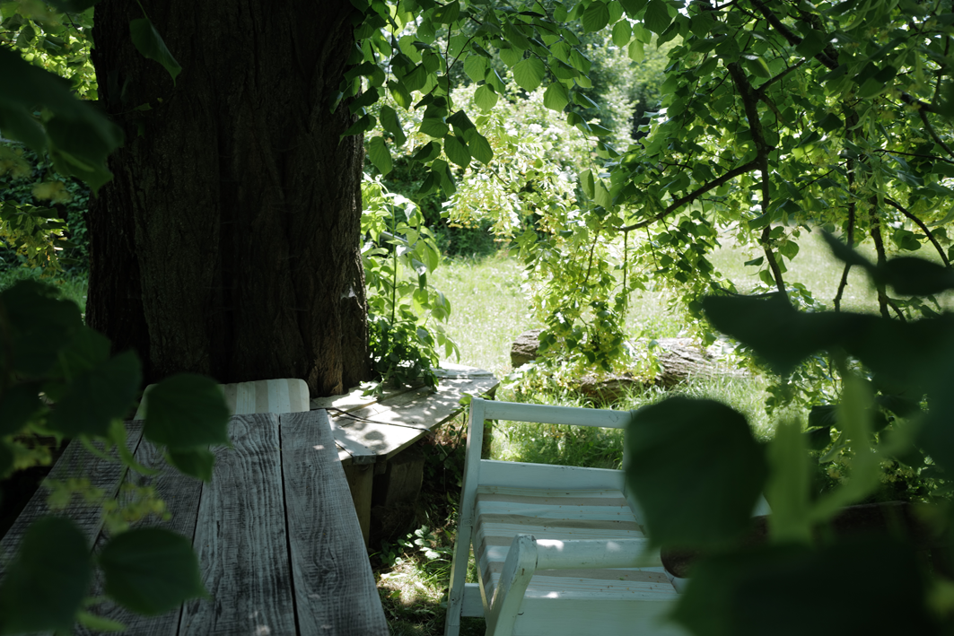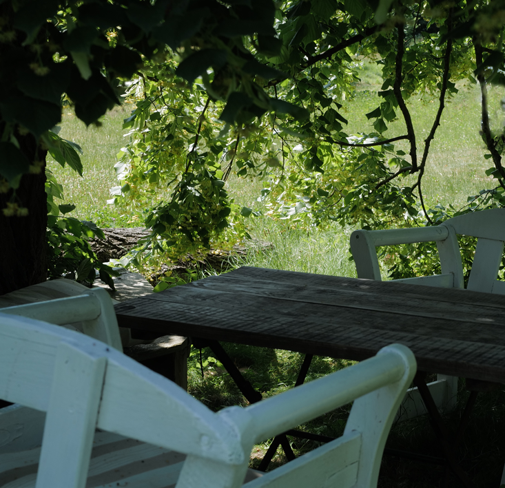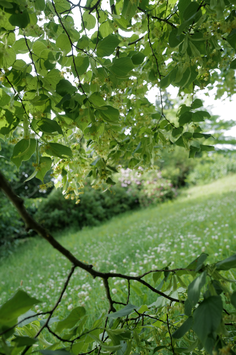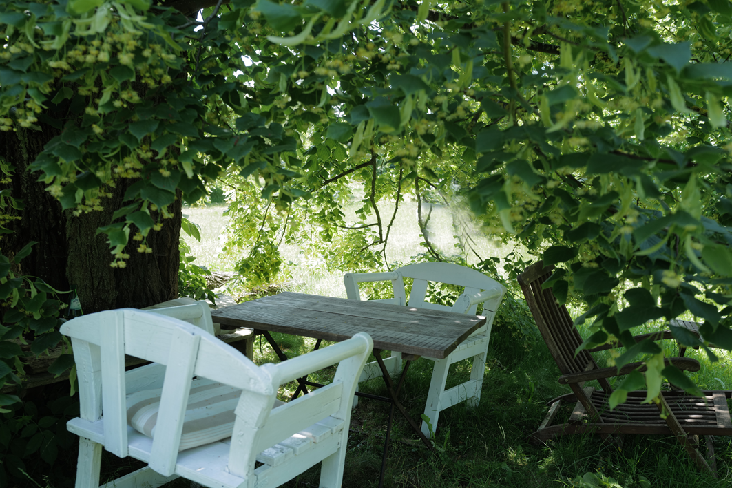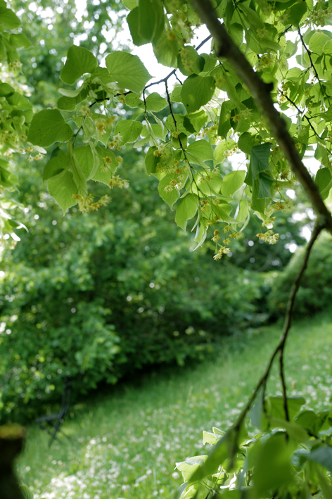 im Halbschatten der Linde blühemd was vor ihr stehenblien nach dem Sturz