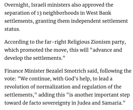 Über Nacht genehmigten israelische Minister auch die Trennung von 13 Vierteln in Siedlungen im Westjordanland und gewährten ihnen einen unabhängigen Siedlungsstatus.