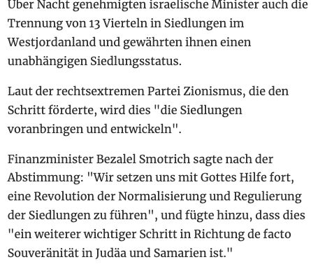 Laut der rechtsextremen Partei Zionismus, die den Schritt förderte, wird dies "die Siedlungen voranbringen und entwickeln".