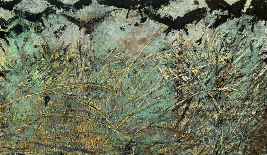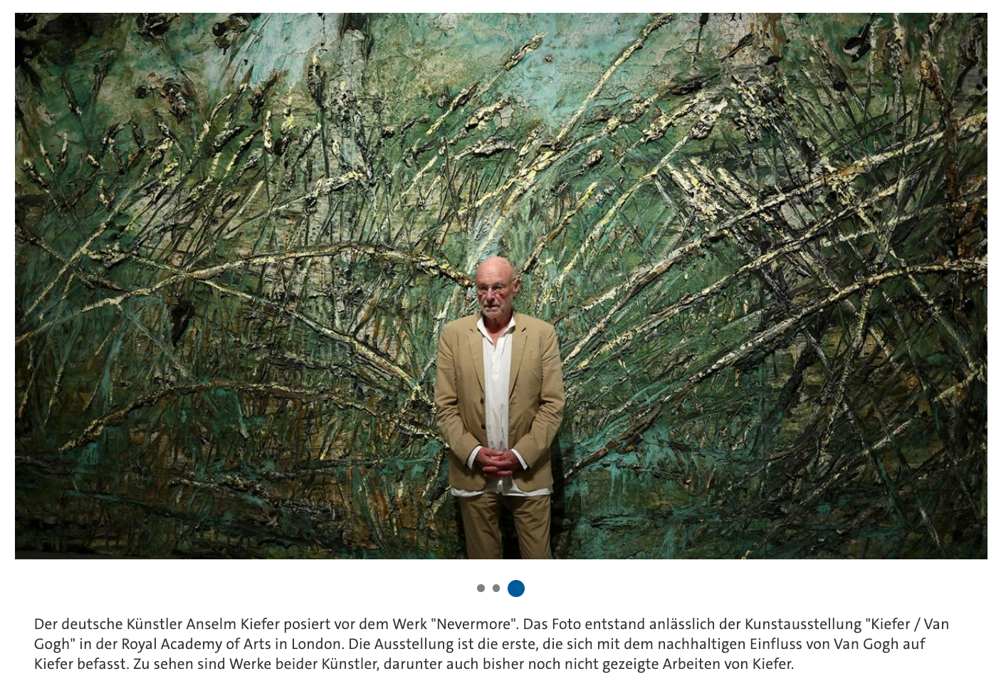 Seltsam, das aktuelle Bild von Anselm Kiefer in London heute morgen aus den Nachrichten des Netzes gefunden. Mit dem Titel "Nevermore"? sehen wir Ähren/Schilf da und Wasser/Himmel dahinter? Davor ihn selbst .
