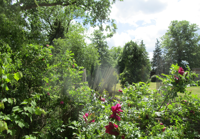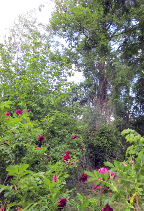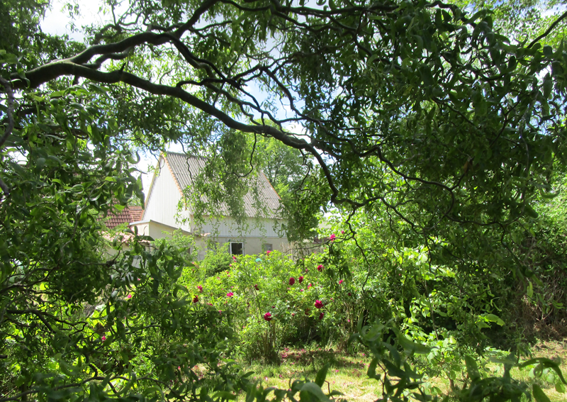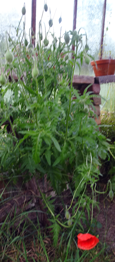 Im Glashaus. Die Erste des Mohns und die Ersten der Multiflora am Haus
