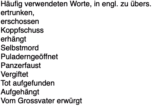 drowned, shot shot in the head hanged suicide wrist veins slit bazooka poisoned found dead hanged strangled by grandfather