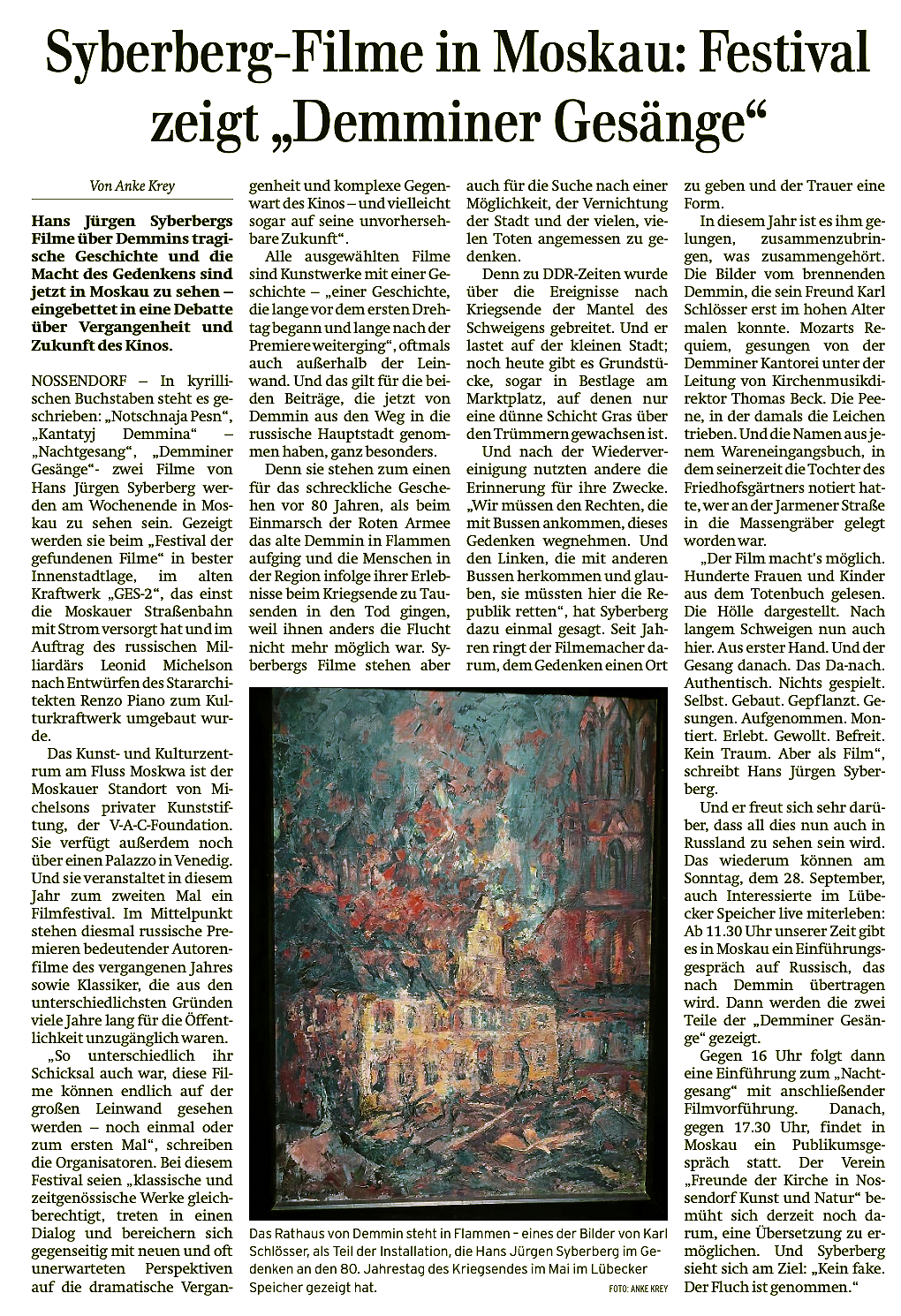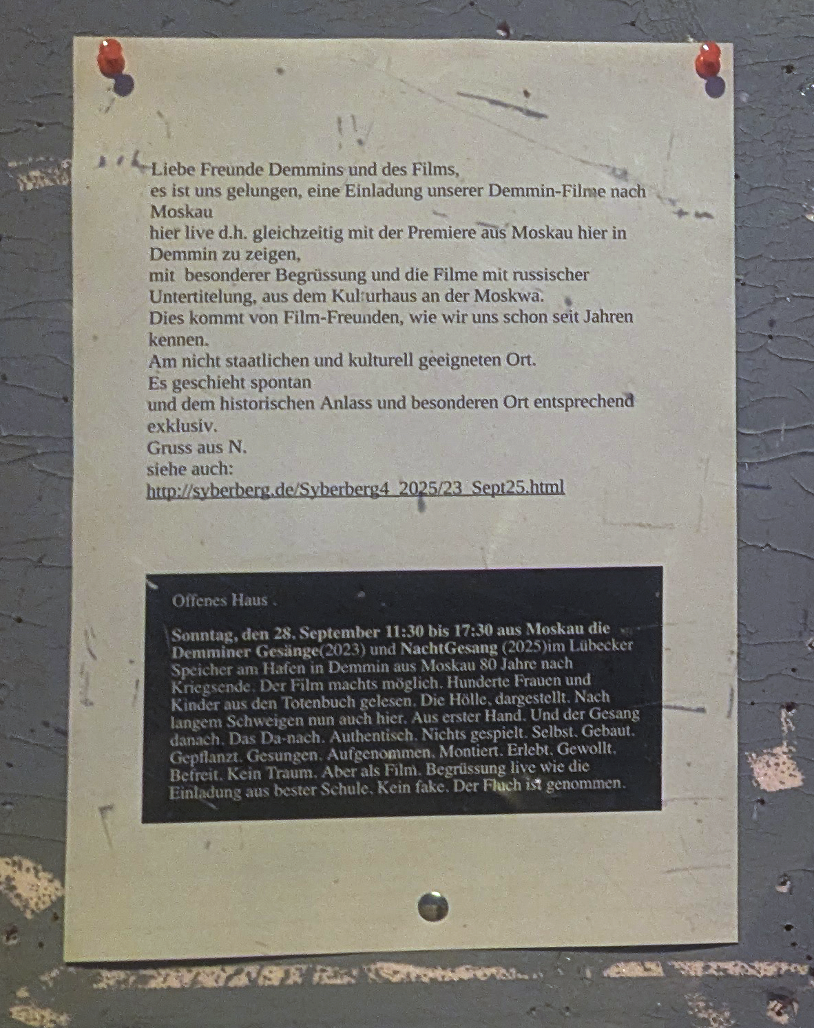 Auch offiziell medial akzeptiert. Dieser FriedensGestus aus Moskau, was aus Deutschland bisher nicht gelang. Die Toten der letzten Schlacht des letzten Krieges hier anzunehmen in der Form des Films als Kunst dieses Jahrhunders in neuer Einfachheit . Und wenn es abseits geschieht, wie dies alles im Pommerland, das abgebrannt, wo denn sonst.