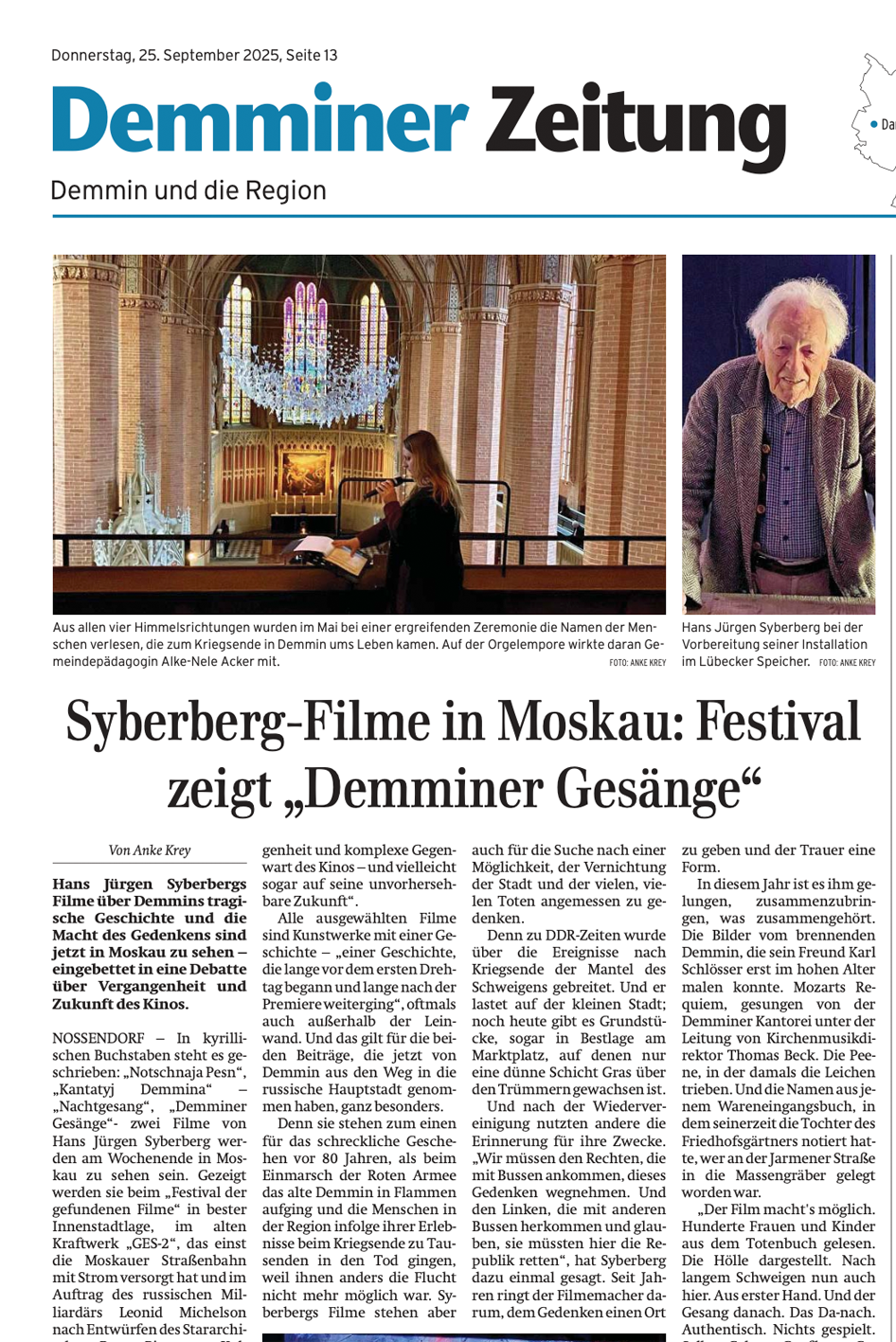 Und von heute 80 Jahre danach dies Demmin. In seinen Gesängen.