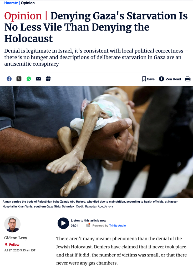 Diese Haltung ist Teil des Mainstreams geworden. Beschreibungen des absichtlichen Hungers in Gaza sind eine antisemitische Verschwörung. Wenn Hunger herrscht, sprechen Sie mit der Hamas.