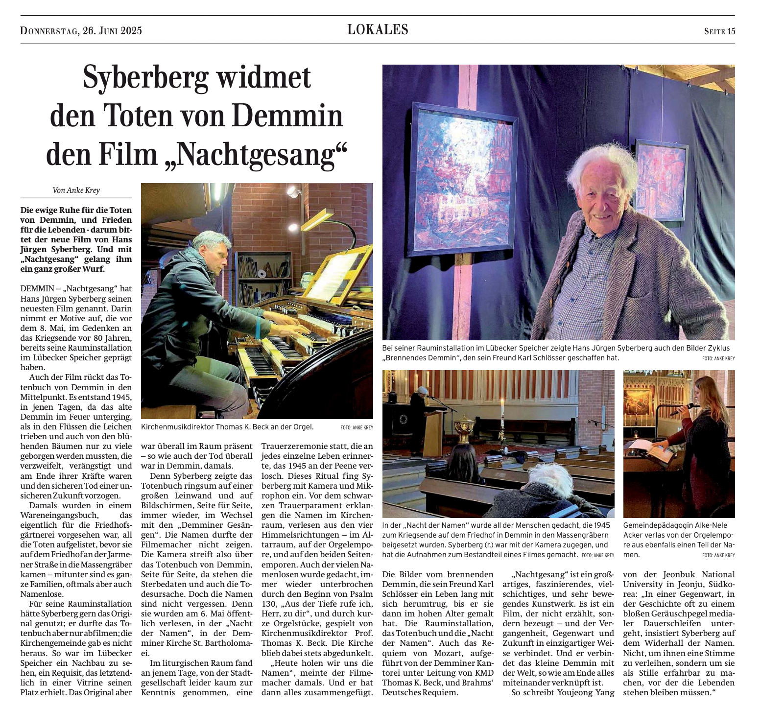 Das kam nicht ohne Widerstände zustande. Die zum Teil angedeutet werden. Zuerst das Nein zu den Bildern von Karl Schlösser, des brennenden Demmin aus eigenem Erleben,als Nein von ausserhalb, dann das Nein die Namen aus dem Totenbuch von 1945 zu zeigen, wie sie aufgeschrieben, sind mit ihren Fundorten, von Kriegen und Geschrei wieder umgeben, der Feinde, mit einem Nein wieder, davon zu sprechen.