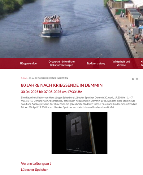 Das hat die Sorge mölgich gemacht, am schlimmsten Ausgang zu wissen wie und wo und was zu tun ist. In Demmin sicher die Entscheidung als alles unterging, Stadt und Menschen, sie Leere sich auftat, in der Mitte selbst, den Weg zu suchen mitten hindurch. Was Hölle war und Fluchten und Trauer durch Kälte und Notz, da anzusetzen, die Namen der Toten selbst zu rufen, dass sie leben nun ewiglich. Umgeben von der Musik die das möglich macht, Rahmen, der es erlaubt, zu danken nur so. Aller Einsamkeiten zum Trotz. In der Gewissheit, die das macht.