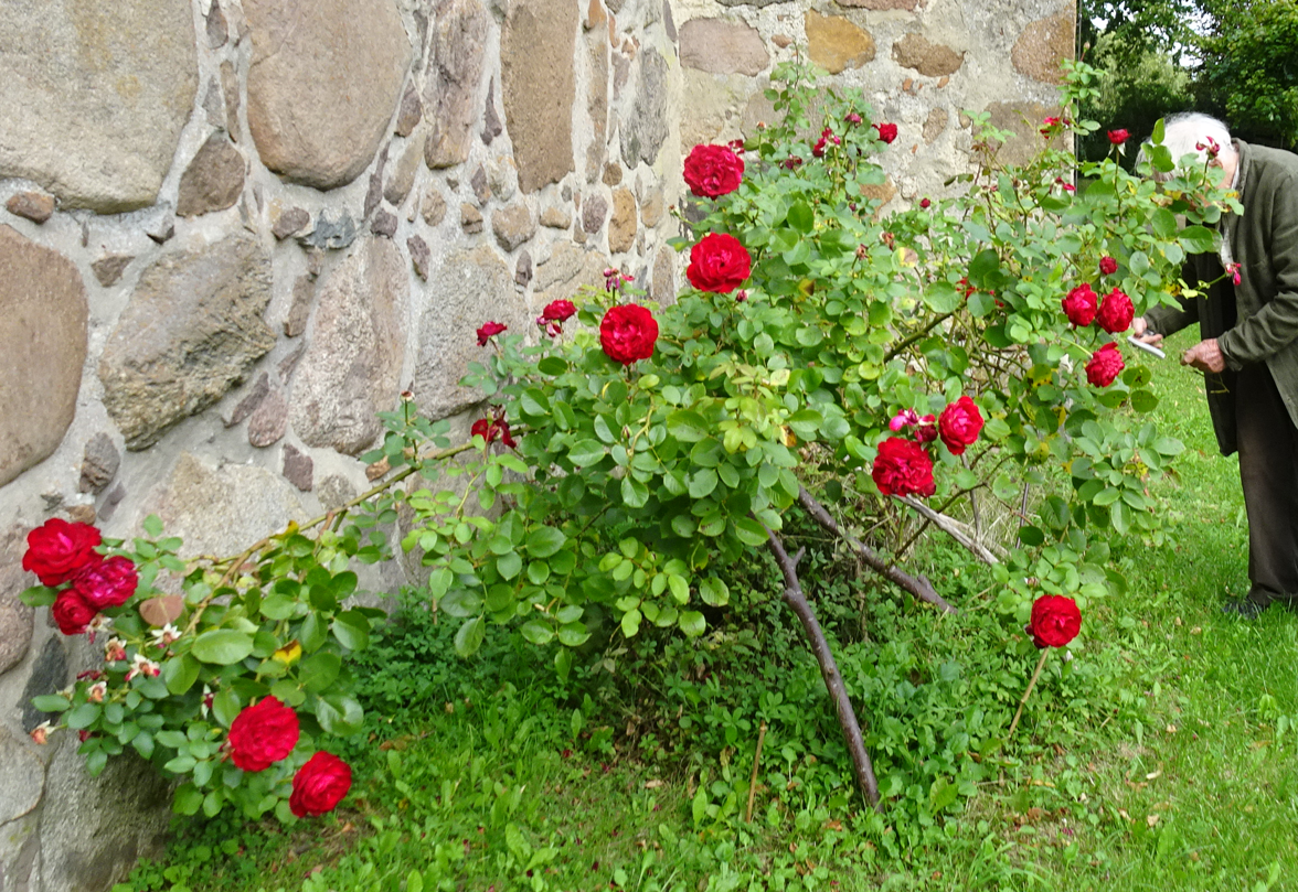 An der Kirchenmauer unter dem Turm, die Rosen schneidend als Dank für die neue Orgel in Nossendorf