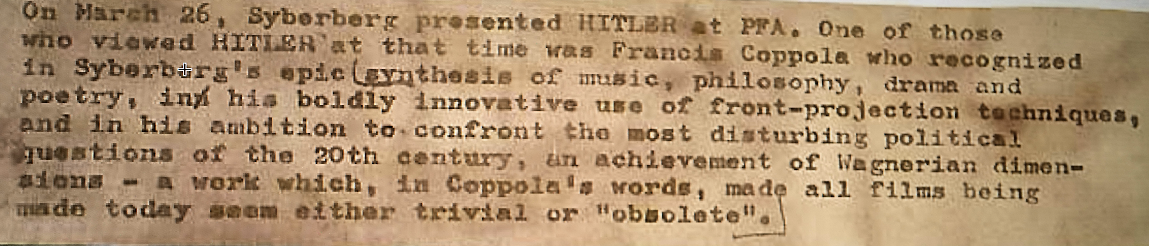 Und es kommt von hier aus diesem NossenDorf, wiederentstanden nach 80 Jahren, anders als vorher, und doch getreu dem Erreichten gegen die Welt aussen im Krieg wieder. Und so anders dieser Film, diesem Ort und Ereignissen gerecht zu werden. In unserem Auftrag. Wie von Euripides vorgezeichnet aus alt-biblischen Gezeiten. Mit selbsterforschten Mitteln. Von heute alles. Bis morgen.