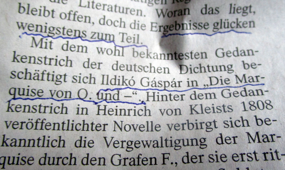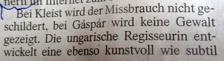 Was den Namen Kleist benutzt und seine Ebene des Gedanken-Strichs verlässt, rutscht ab ins Nichts. Ohne die Nobless Kleists ist diese Marquise Missbrauch unserer feministischen Zeit.