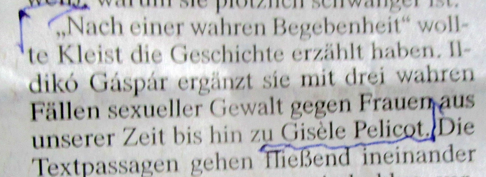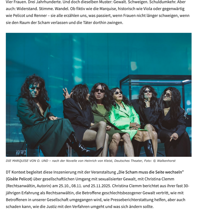 Eine Verbindung vom Fall Pelicot und dieser Figur des Kleist aus seinem Text oder verglichen mit dem was wir aus Filmen kennen ist eher die eine Vergewaltung oder Missbrauch der Vorlage von Grund auf. Die Darsteller sind arm, in diesem System erscheinen zu müssen.