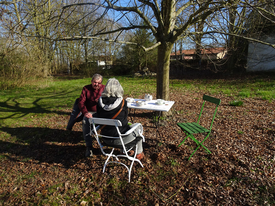 Tisch raus, Sonne, unter der Linde vor dem Haus