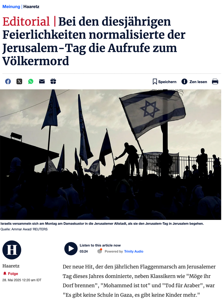 Deutschland hat die Erinnerung an den Holocaust und seine Lehren verraten. Ein Land, das seine höchste Aufgabe als nicht vergessen ansah, hat es vergessen. Ein Land, das sich selbst gesagt hat, dass es niemals schweigen würde, schweigt. Ein Land, das einst "Nie wieder" sagte, und jetzt: "wieder, mit Waffen, mit Finanzierung, mit Schweigen. Es gibt kein Land, das besser sein sollte als Deutschland, "Ekelprozesse abzulegen". Jeder Deutsche weiß viel mehr über sie als Yair Golan. Hier in Israel sind sie in vollem Gange, aber Deutschland hat sie noch nicht als das erkannt, was sie sind. Erst vor kurzem wimmelte es zu spät und zu wenig.