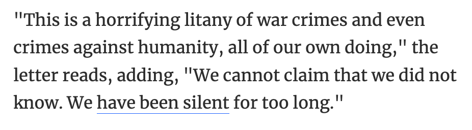 "Dies ist eine entsetzliche Litanei von Kriegsverbrechen und sogar Verbrechen gegen die Menschlichkeit, die wir alle unsere eigenen tun", heißt es in dem Brief und fügt hinzu: "Wir können nicht behaupten, dass wir es nicht wussten. Wir haben zu lange geschwiegen."