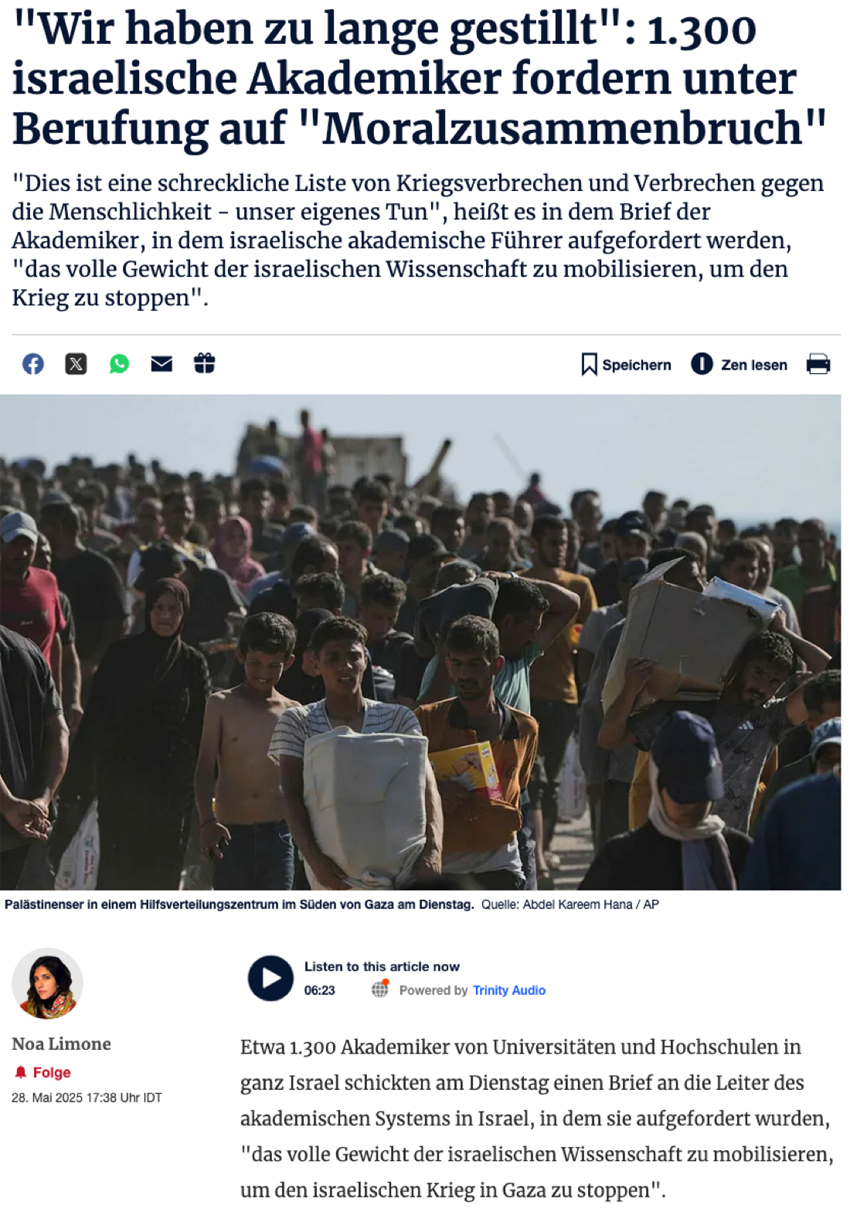 "Dies ist eine schreckliche Liste von Kriegsverbrechen und Verbrechen gegen die Menschlichkeit - unser eigenes Tun", heißt es in dem Brief der Akademiker, in dem israelische akademische Führer aufgefordert werden, "das volle Gewicht der israelischen Wissenschaft zu mobilisieren, um den Krieg zu stoppen".