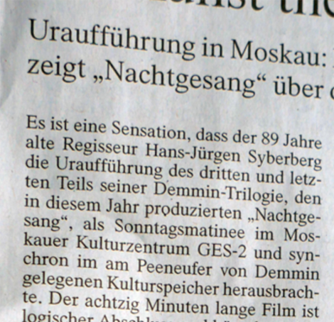 Wie der Film aus Deutschland, den sie aus den USA als Unseren H. annahmen und wie nun diese Demminer Gesänge zusammen mit seinem NachtGesang als Revolution of of a graet, bold German Epic mit den Ohren zu denken.