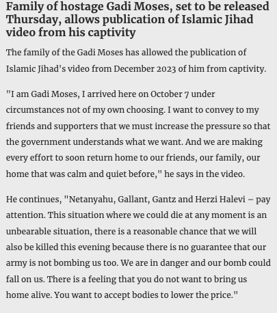 Er fährt fort: "Netanyahu, Gallant, Gantz und Herzi Halevi – achten Sie darauf. Diese Situation, in der wir jeden Moment sterben könnten, ist eine unerträgliche Situation, es besteht eine vernünftige Chance, dass wir heute Abend auch getötet werden, weil es keine Garantie gibt, dass unsere Armee uns nicht auch bombardiert. Wir sind in Gefahr und unsere Bombe könnte auf uns fallen. Es gibt das Gefühl, dass Sie uns nicht lebend nach Hause bringen wollen. Sie wollen Körper akzeptieren, um den Preis zu senken."