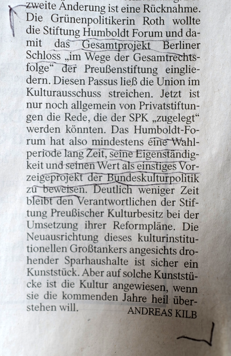 Das Schloss mit Humboldt im Namen ausdrücklich aufgerufen seine Eigenständigkeit als Vorzeigeprojekt der BundesRepublick zu beweisen. Und somit seine schwarze Fahne des Untergangs endlich loszuwerden.