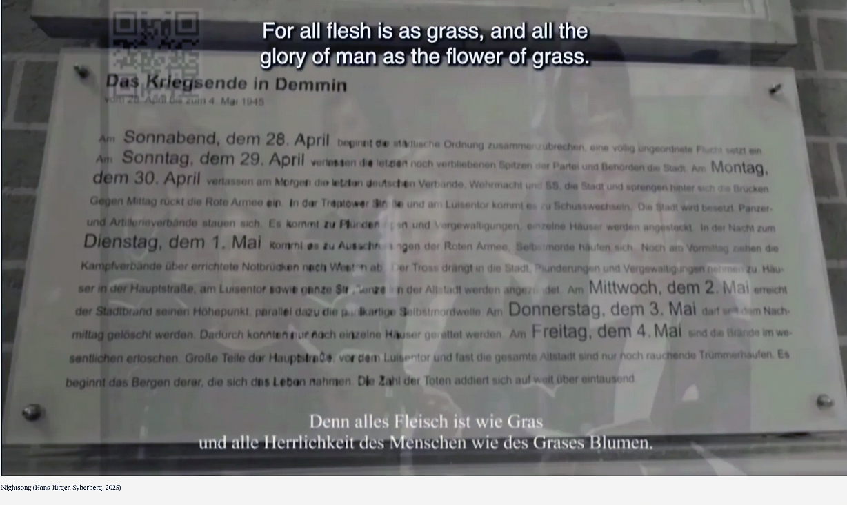 Denn der Film ist die Geschichten dazu heutiger Situation, wie dargestellt. in Ton und Bild. Wie sie zur Kathedrale werden aus den Namen der Toten von 1945 als Film am letzten Tag des Krieges in Demmin.