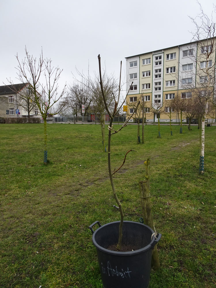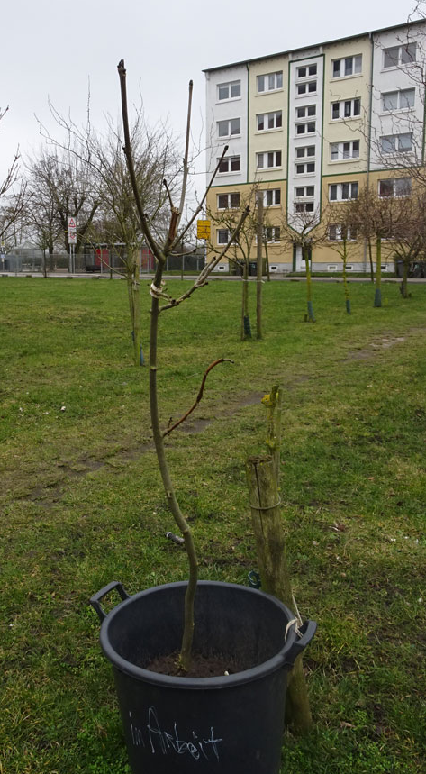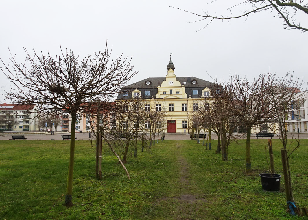 Eine kleine Allee über die leeren Hinterhöfe des ehem. Marktes in Demmin, mit Hilfe des VorPommern Fonds entstanden, im Programm Machbarkeits-Studie.