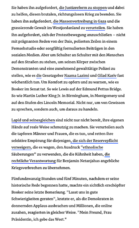 Sie haben ihn aufgefordert, die Justizreform zu stoppen und dabei zu helfen, diesen brutalen, richtungslosen Krieg zu beenden. Sie haben ihn aufgefordert, die Massenvertreibung in Gaza und die grassierende Gewalt im Westjordanland zu verurteilen. Sie haben ihn aufgefordert, sich der Protestbewegung anzuschließen – nicht mit prägnanten Reden von der Dais, polierten Zeilen in einem Fernsehstudio oder sorgfältig formulierten Beiträgen in den sozialen Medien. Aber um Schulter an Schulter mit den Menschen auf den Straßen zu stehen, um seinen Körper zwischen Demonstranten und eine zunehmend gewalttätige Polizei zu stellen, wie es die Gesetzgeber Naama Lazimi und Gilad Kariv fast wöchentlich tun. Um Komfort zu opfern und zu warnen, wie es Booker im Senat tat. So wie Lewis auf der Edmund Pettus Bridge. So wie Martin Luther King Jr. in Birmingham, in Montgomery und auf den Stufen des Lincoln Memorial. Nicht nur, um von Gewissen zu sprechen, sondern auch, um daraus zu handeln.