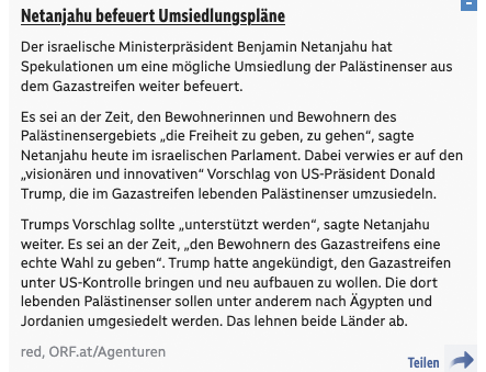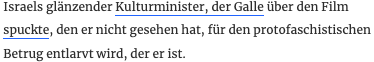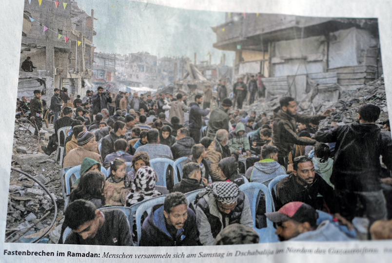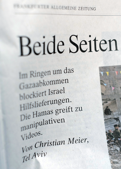 Die FAZ spricht von manipolativen Videos, wenn sie das, was in Gaza geschieht, als kulturelle Installation zwischen den Ruinen, darstellt in einem Bilde wie einen Müllhaufen von PlastikMenschen, die von den Netanjahus nun verurteilt werden abzuhauen oder wie Schrott zu entsorgen. Dagegen stehen die Bilder dieser Leistung zu überleben.