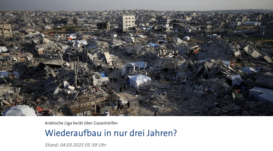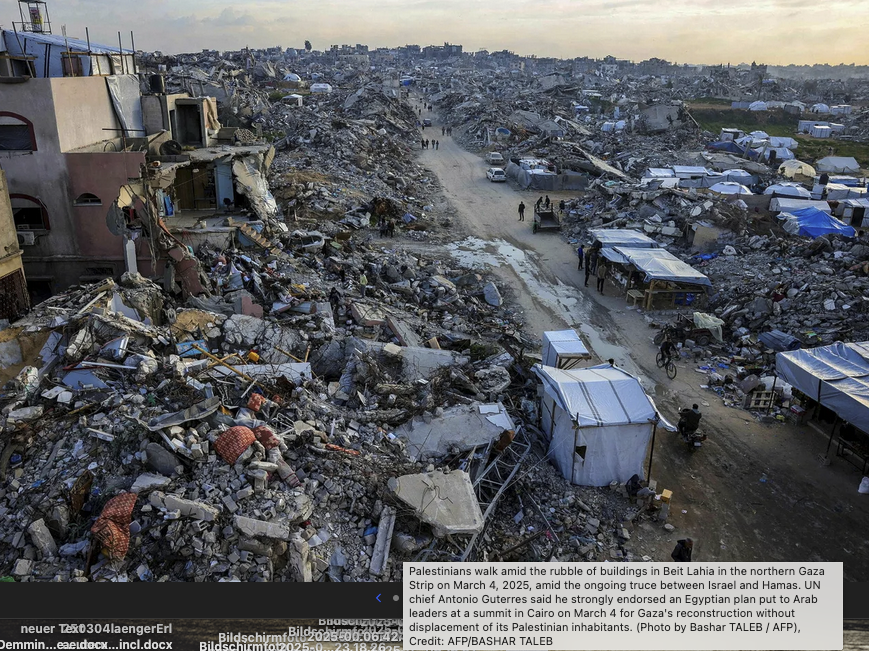 US-Präsident Donald Trump hatte vorgeschlagen, Gaza in eine „Riviera des Nahen Ostens“ zu verwandeln und die rund zwei Millionen Palästinenser und Palästinenserinnen nach Ägypten und Jordanien dauerhaft „umzusiedeln“. Die UNO warnte daraufhin vor einer „ethnischen Säuberung“. Trumps Pläne hatten in der arabischen Welt und darüber hinaus Empörung ausgelöst.