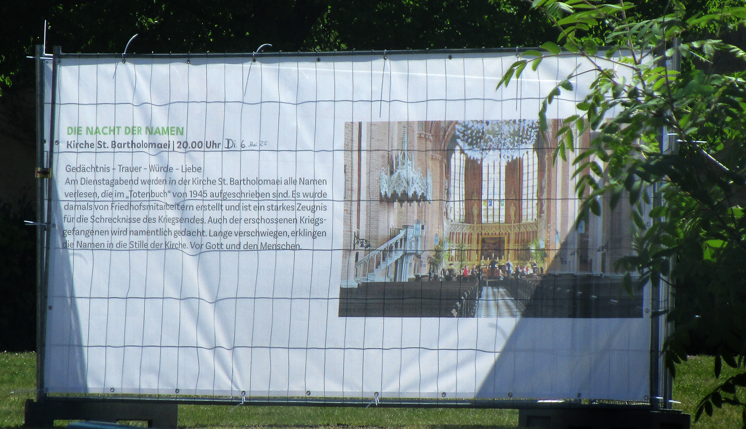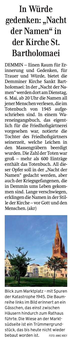 Die Installation im L.Speicher und die Lesung der Namen aus dem Buch der Toten 1945 Demmins in der Kirche St.Bartlom. sowie der Markt mit seinem Kellergang aus Bäumen nun der Bürger selbst über dem Markt auf dem Totenacker des Brandes machen zusammen ein Demmin 80 Jahre nach dem lezten Krieg, das jene ernstnimmt, die damals darin umkamen. Selbst zum Gesang werdend. In der Nachfolge. Vom Schwanengesang zum Gesamtkunstwerk eines Weltgewissens.