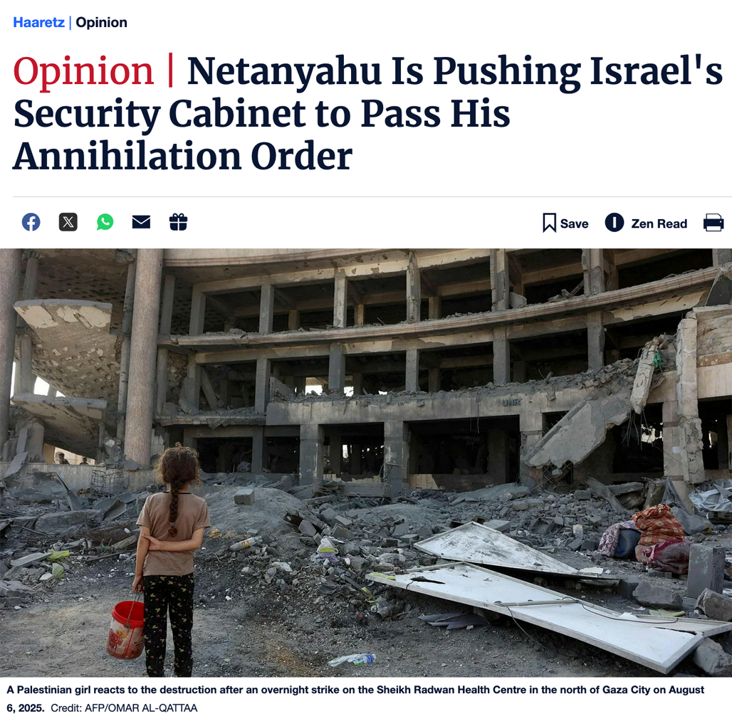 For the first time in Israel's history, the security cabinet is slated to make a decision on annihilation on Thursday. Prime Minister Benjamin Netanyahu's plan to occupy the Gaza Strip, which clearly no one in the security cabinet will challenge, means confirming the killing of thousands of people, demolishing the living conditions of more than two million walking dead and carrying out the final destruction of a busy, crowded strip of land where people once lived, but will no longer.