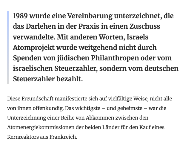 Lieferung der nötigen Maschinen aus Frankreich. Warum!Aus Süd-Afrika, , die nötigen Anteile von natürlichen Stoffen, Uran usw. Finanziert das alles von Deutschland, wie sich jetzt im Detail zeigt, und warum legitimiert.