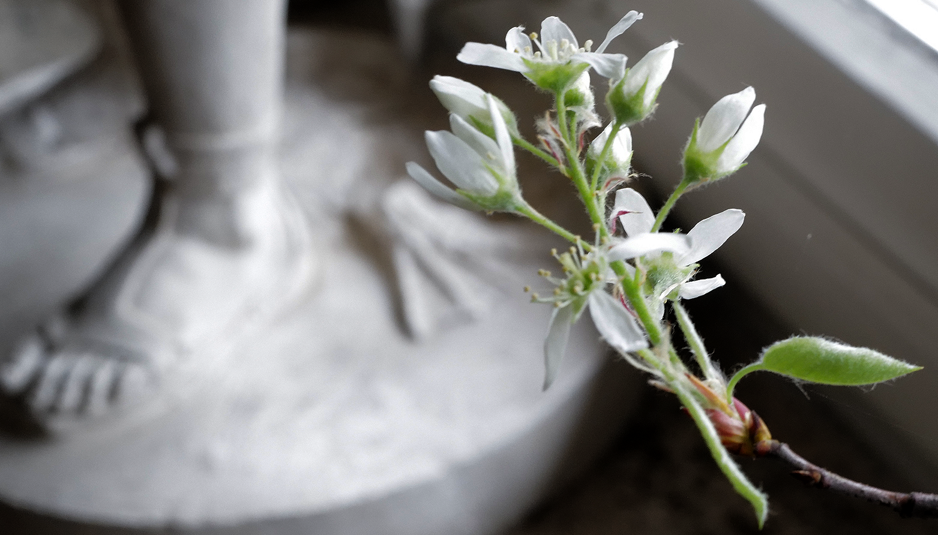 jetzt sind sie ausgekrochen nach drinnen geholte Zweige der Felsenbirne