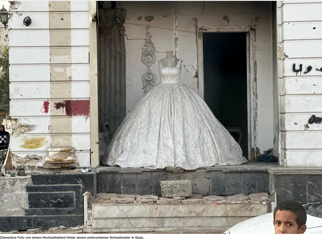 Durchdrungen in ihrem Fotoarchiv im Gazastreifen sind auch Momente verblüffender Schönheit – ein spektakulärer Sonnenuntergang über einer Stadt mit Zelten, ein Brautkleid, das hinter einem zerbrochenen Schaufenster unberührt bleibt – sowie mehrere Bilder von Cherevko selbst: blaue Augen, ein Nasenring, sorgfältig aufgetragener Lippenstift und eine blaue UN-Flakjacke.