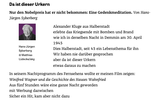 In der ZEIT ein paar Stimmen, anrührend und nahe. So von Edgar Reitz seit früher Zusammenarbeit bis zuletzt, Rohrbach vom FS/WSR kundig und getreu, Schlöndorff ja.
