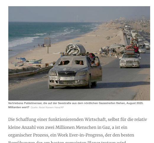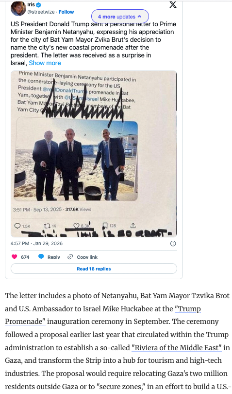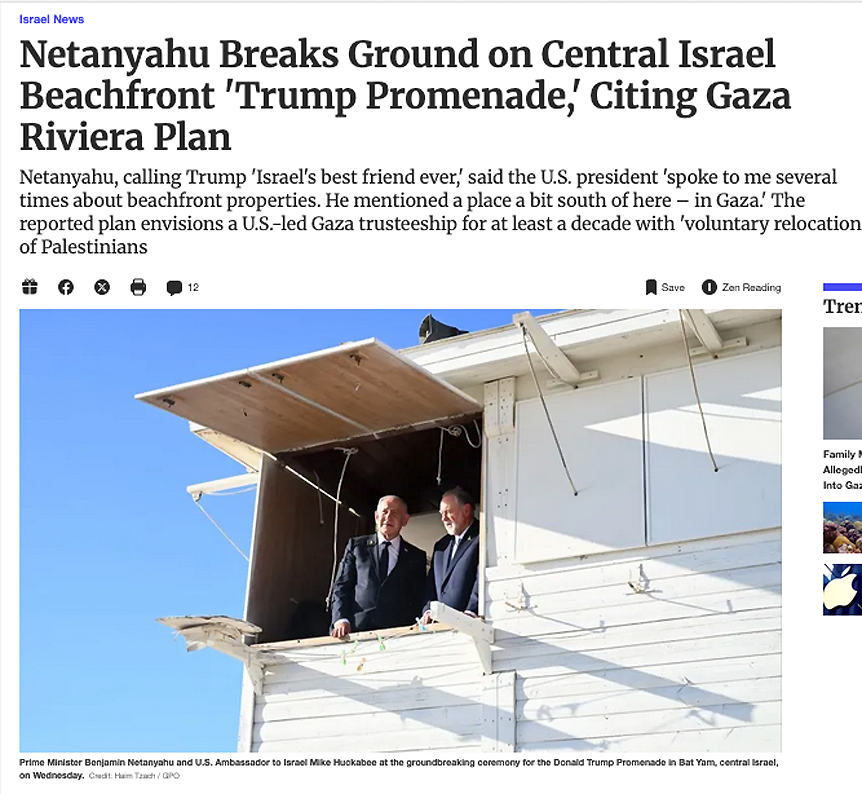 Trump-Promenade. Der klassische Fall von europ. Kolonisation. Diesmal aus Amerika in Palestina . Nach der Bibel Endzeitvisione mit Apokalypse davor (A) ohne Rettung. Die Schaafe werden von den Juden selbst zur Flucht begleitet.