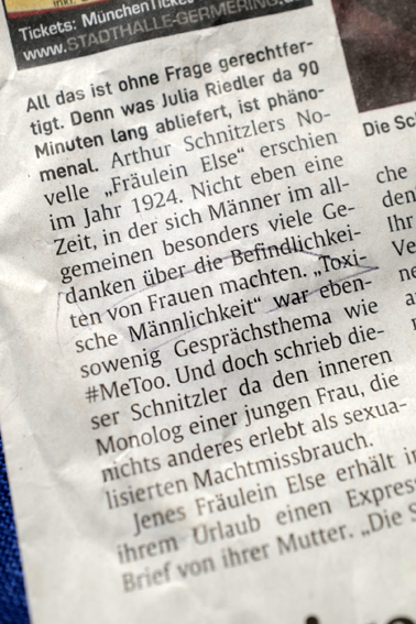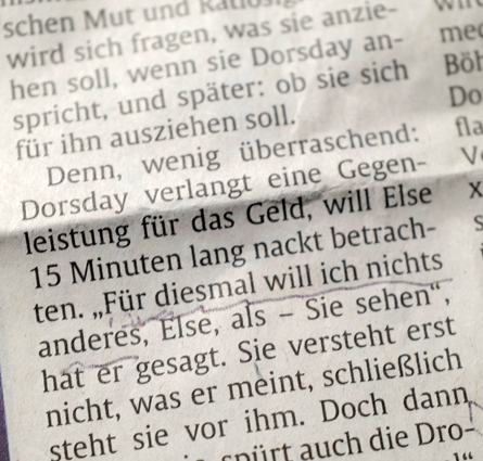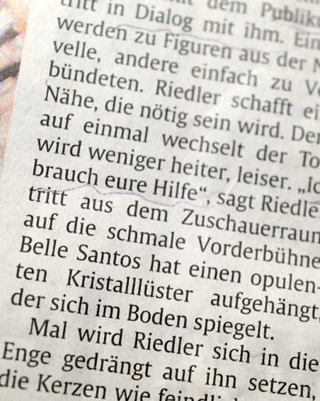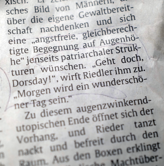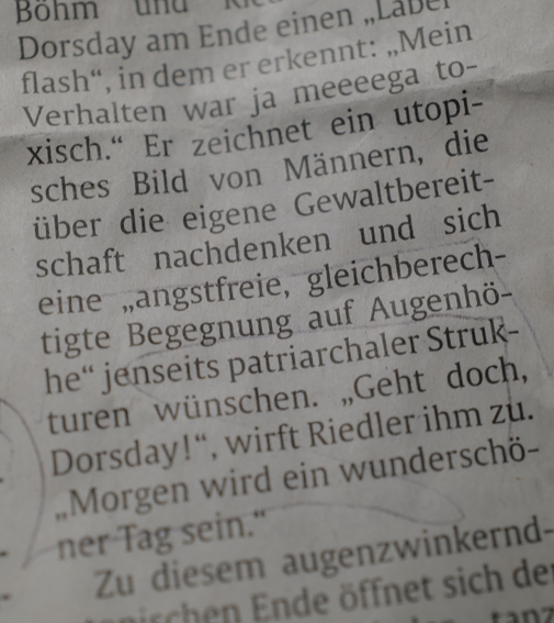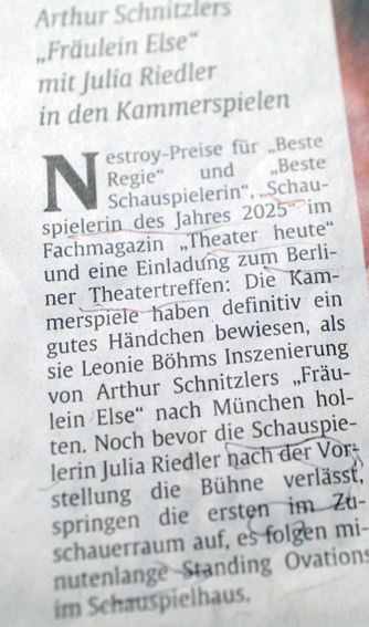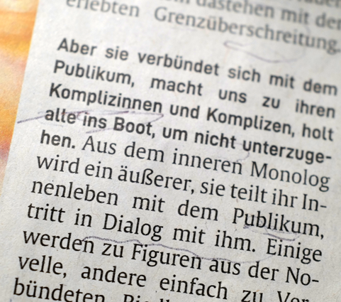 Danach die Penthesilea von Kleist 4 Stunden als Monolog. Auch das muss da drin sein können, in so einem Schnitzer. Da hilft kein Ranschmeissen an das Publikum.