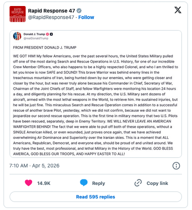 JD Vance lobte die "absoluten Helden", die die Rettung auf einem Posten auf X abgeschlossen haben, und fügte hinzu: "Nach einer unglaublich gefährlichen und intensiven Mission haben die US-Spezialkräfte den zweiten abgeschossenen F-15-Waffensystemoffizier nach einem schweren Feuergefecht erfolgreich lokalisiert, gerettet und exfiltriert.