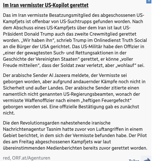 Die Rettungsaktion, an der Dutzende von Militärflugzeugen beteiligt waren, stieß auf heftigen Widerstand des Iran. Reuters berichtete am Freitag, dass zwei Black Hawk-Hubschrauber, die an der Suche beteiligt waren, von iranischem Feuer getroffen wurden, aber aus dem iranischen Luftraum entkamen. In einem separaten Vorfall stürzte ein Pilot aus einem A-10 Warthog-Kampfflugzeug, nachdem es über Kuwait getroffen wurde und abgestürzt war, sagten die Beamten, obwohl das Ausmaß der Besatzungsverletzungen unklar war.Das iranische Staatsmedien-Outlet Tasnim zitierte die Revolutionsgarden, die sagten, dass während der Rettungsmission mehrere "fliegende Objekte" zerstört wurden. Ein Sprecher des Unified Command of the Iranian Armed Forces sagte, dass das abgeschossene US-Flugzeug ein militärisches Transportflugzeug der C-130 und zwei Black Hawk-Hubschrauber umfasste, so Tasnim.Die New York Times berichtete, dass die Vereinigten Staaten zwei Transportflugzeuge stationiert haben, um sowohl ein Besatzungsmitglied als auch die Truppen zu evakuieren, die geschickt worden waren, um ihn zu lokalisieren, unter Berufung auf eine hochrangige USA. Armeebeamter. Die beiden Flugzeuge seien jedoch auf einem abgelegenen US-Stützpunkt im Iran gestrandet, sagte der Beamte.Dem Bericht zufolge wurden drei weitere Flugzeuge zur Evakuierung der US-Truppen eingesetzt, die auch die beiden gestrandeten Flugzeuge zerstörten, um zu verhindern, dass sie in iranische Hände fielen."In den letzten Stunden hat das Militär der Vereinigten Staaten eine der gewagtesten Such- und Rettungsaktionen in den USA durchgeführt. Geschichte", heißt es in einer Erklärung von Trump, die von der Pressesprecherin des Weißen Hauses, Karoline Leavitt, auf X gepostet wurde.Der Kampfjet war das erste US-Flugzeug, das seit Beginn des Krieges Ende Februar auf iranischem Territorium abgestürzt war.