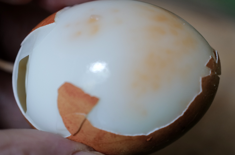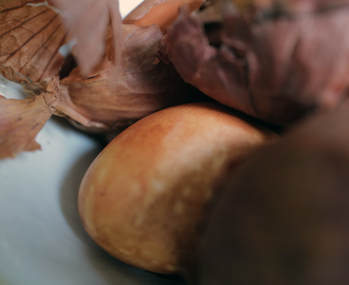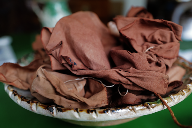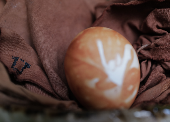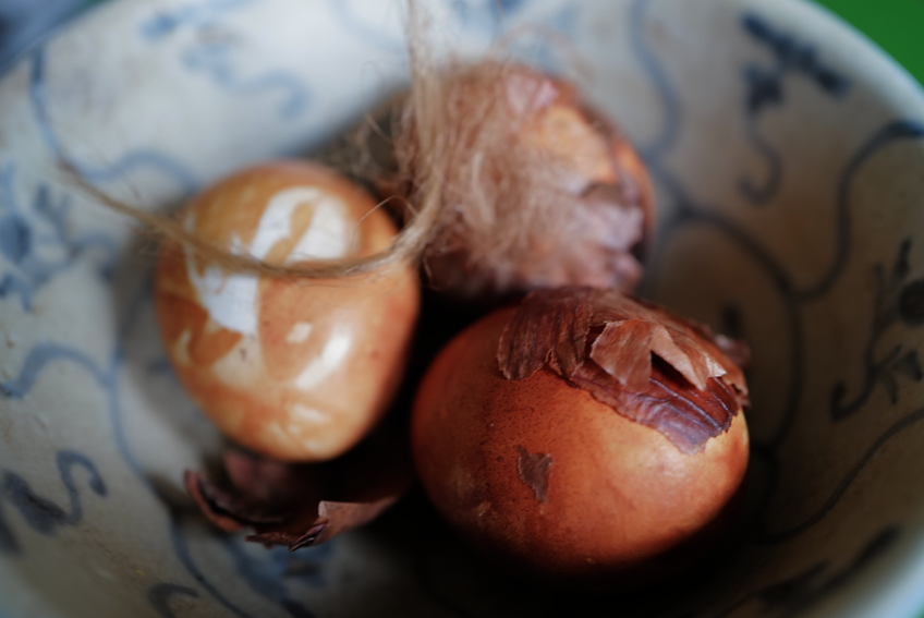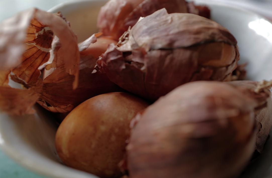 Am Ende ohne Blätter der Zwiebel, allein um übriggebliebenen Sud gefärbt mit Falten des umhüllenden Stoffes einzefasst.